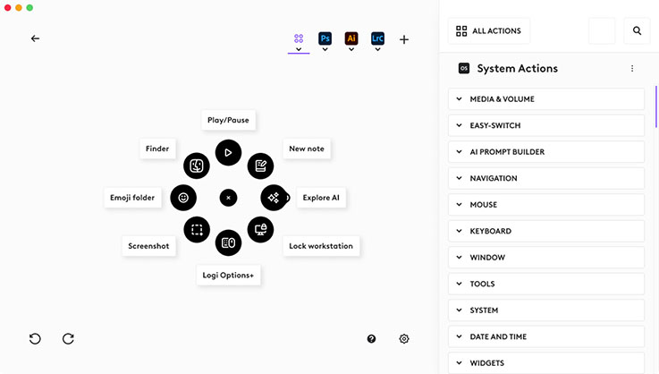 MX Master 4 için göze çarpan yeniliklerden bir diğeri de Aksiyon Halkası. Buna üretkenlik merkezi de denilebilir. Başparmağınız ve yan tekerlek ile kontrol edilebilen bu özelliğe 8 adet kısayol atanabiliyor. Logi Options+ ile etkinleştirilen ve özelleştirilebilen bu alan, detaylı bir şekilde ayarlanabiliyor. Kısayollar kullandığınız bazı programlara göre özelleştirilebiliyor. Photoshop, Lightroom, Premier Pro, DaVinci, Final Cut Pro gibi farklı birçok programda farklı görevler atanabiliyor. Kısa bir alışma sürecinden sonra iş akışında hızlanma sağlayacağını düşünüyorum. Önceki modellerden farklı olarak yan tarafa bir düğme daha eklendiğini görüyoruz. İleri geri düğmelerinden biraz ileride olan bu tuşa hareket düğmesi denmiş. Bir kere bastığınızda farklı masaüstü pencereleri karşınıza gelirken basılı tutup yukarı-aşağı veya sağa-sola hareket ettirdiğinizde farklı görevler yapıyor. İleri-geri ve bu hareket tuşunu özelleştirmeniz mümkün tabi…
