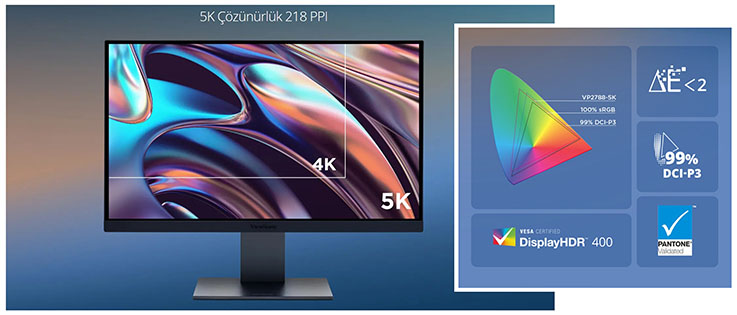 VP2788 5K, hem MAC hem de PC kullananlar için üst düzey bir renk doğruluğu sunuyor. %99 DCI-P3 renk gamı kapsamı sunuyor. Aynı zamanda %100 sRGB ve %100 Rec.709 kapsamına da sahip. Baskı konusunda ihtiyaç duyulan Adobe RGB renk gamının da %88’ini karşılayabiliyor. Ancak şunu söyleyebilirim ki 5K yüksek çözünürlüğünden dolayı bu monitör daha çok video içeriklerle uğraşan editörler için uygun olacaktır. Yoksa daha uygun fiyatlarla da ihtiyaçlarınızı karşılayacak gayet iyi ViewSonic modelleri bulunabilir.